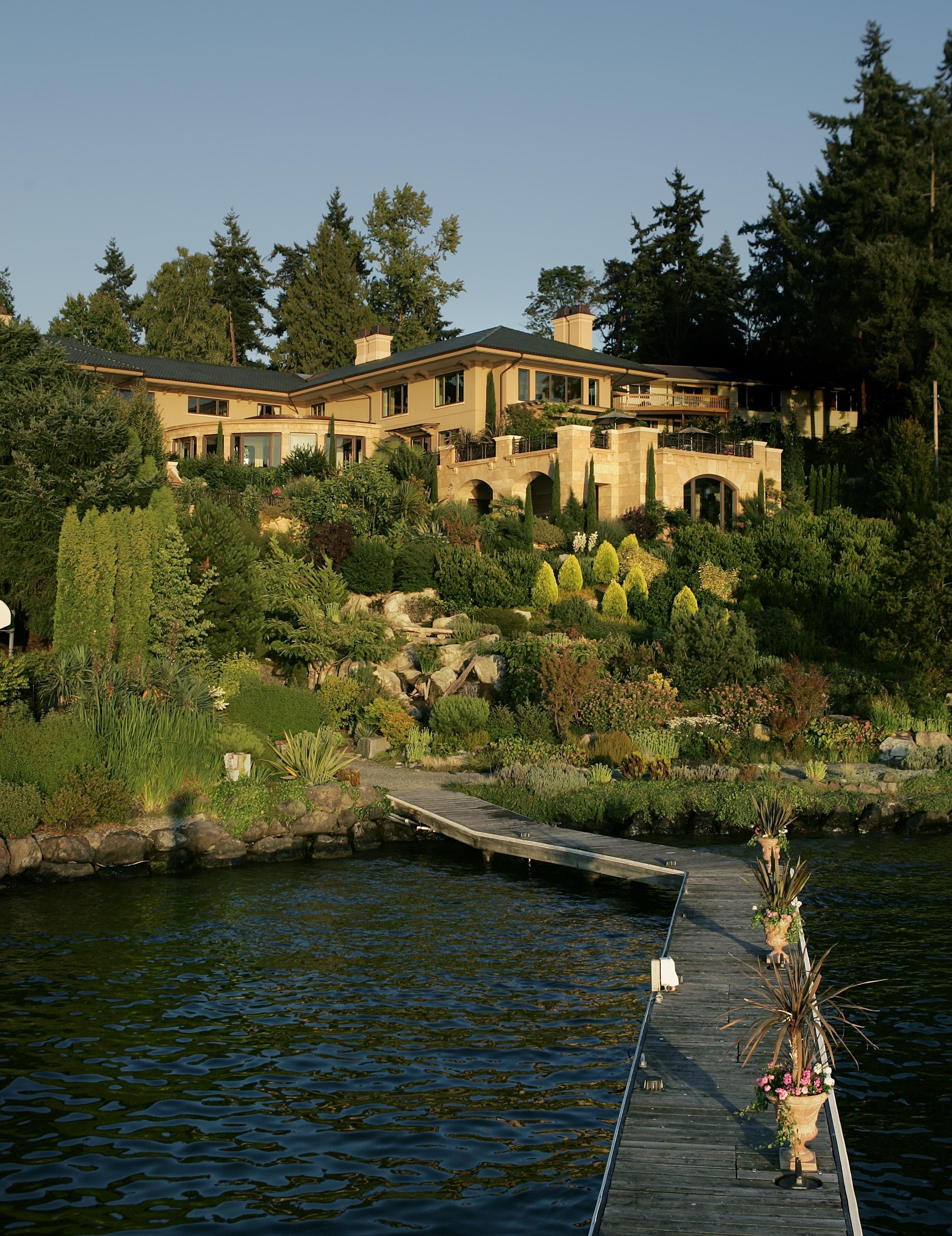 The sprawling, lush grounds at the Mercer Island home also feature a sizeable greenhouse, formal outdoor pool with fountains, meandering walking path leading to the lakefront, a stocked trout pond, and a deep water dock that previously accommodated a 140-foot yacht.
