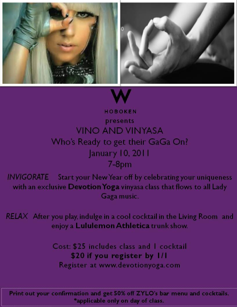 Start your New Year off with YOGA GAGA! Yes, that’s YOGA + LADY GAGA! Celebrate your uniqueness & join the W Hoboken in a playful and energetic vinyasa class that flows to all Lady Gaga music. After you play, indulge in a cool cocktail at the W Hoboken’s Living Room and enjoy a Lululemon Athletica trunk show!