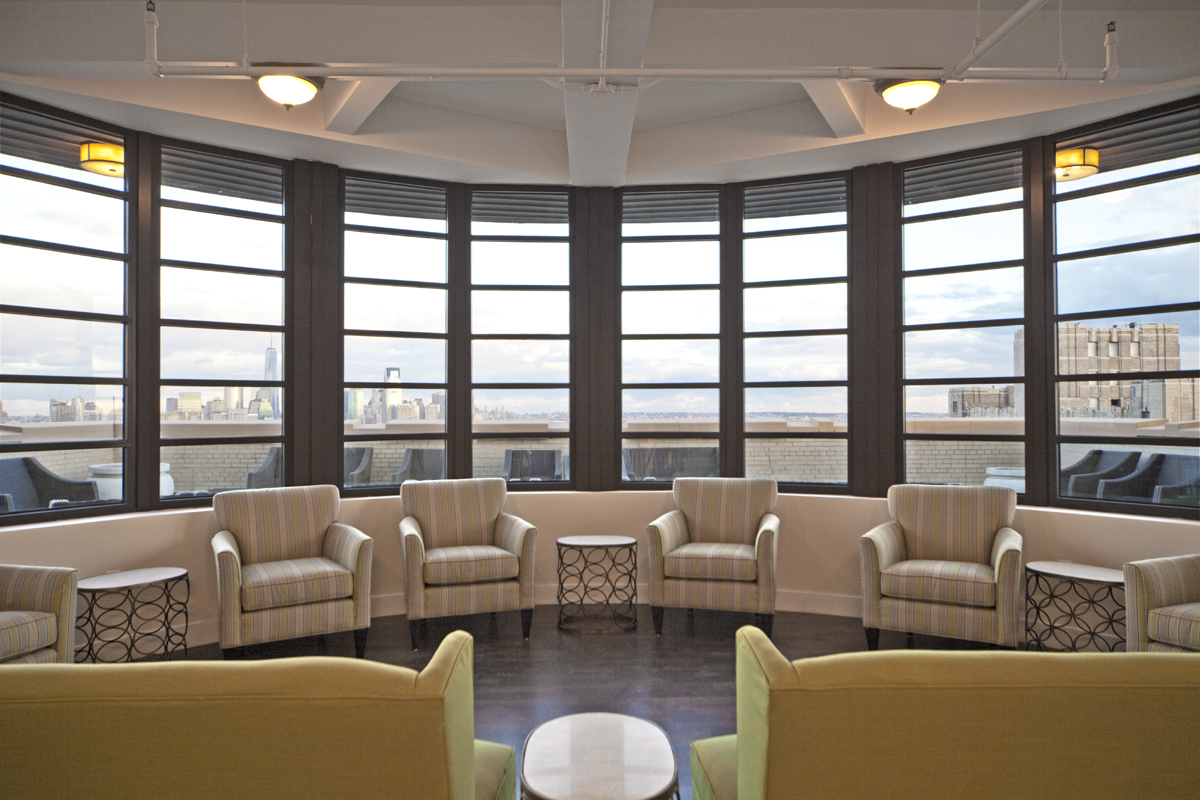 Residents of The Paramount will also enjoy a private amenity offering, including a fitness center with state-of-the-art Cybex equipment, separate yoga room, lounge area, and restrooms with lockers and showers. A Clubroom on the first level features multiple lounge areas, a projection screen TV and Wifi, while additional lounge areas with WiFi and seating are found on the mezzanine level. On the 19th floor, a sunroom/conservatory with outdoor furnished terrace offers stunning views of the Manhattan skyline and Statue of Liberty.