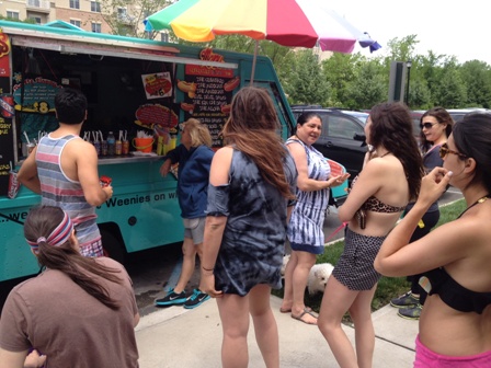 Festive Saturday Afternoon Party at Popular Outdoor Pool Featured Beach Balls, Flip Flops and Hot Dogs