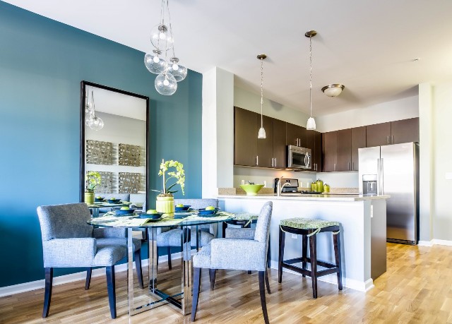 All residences at Water’s Edge include contemporary interior spaces with upscale appointments such as hardwood floors in living areas, plush carpeted bedrooms, soaring 9-foot ceilings and high-efficiency washer/dryers. Chef-inspired kitchens boast stone countertops, custom cabinetry, and an enviable collection of stainless steel appliances, which include a dishwasher and gas range. The homes range in size from 545 to 1,232 square feet. Private outdoor space is available and residents receive complimentary window treatments.