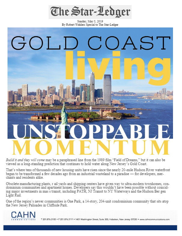 The Star Ledger shines a light on the dynamic NJ Gold Coast which showcased eight of our clients: BNE Real Estate Group’s The Enclave and One Harrison, COA’s 99 Hudson, Ironstate Development Company and Panepinto Properties’ 90 Columbus, The Cliffs Collection, JMF Properties’ Harbor Station South and Harbor View Marketplace in Bayonne, Gulls Cove, Bijou Properties 7 Seventy House and Edge Lofts in Hoboken, Lennar Urban’s Henley on Hudson and 1200 Avenue at Port Imperial in Weehawken, and DMG Investment’s One Park in Cliffside Park.