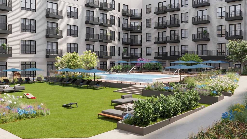 Available homes include loft-style apartments with 13-foot ceiling spans and dark hardwood flooring, and standard-sized apartments with 10-foot ceiling spans and whitewashed wood flooring. All of the units include a washer and dryer, smart lock keyless home entry, and kitchens with quartz countertops.